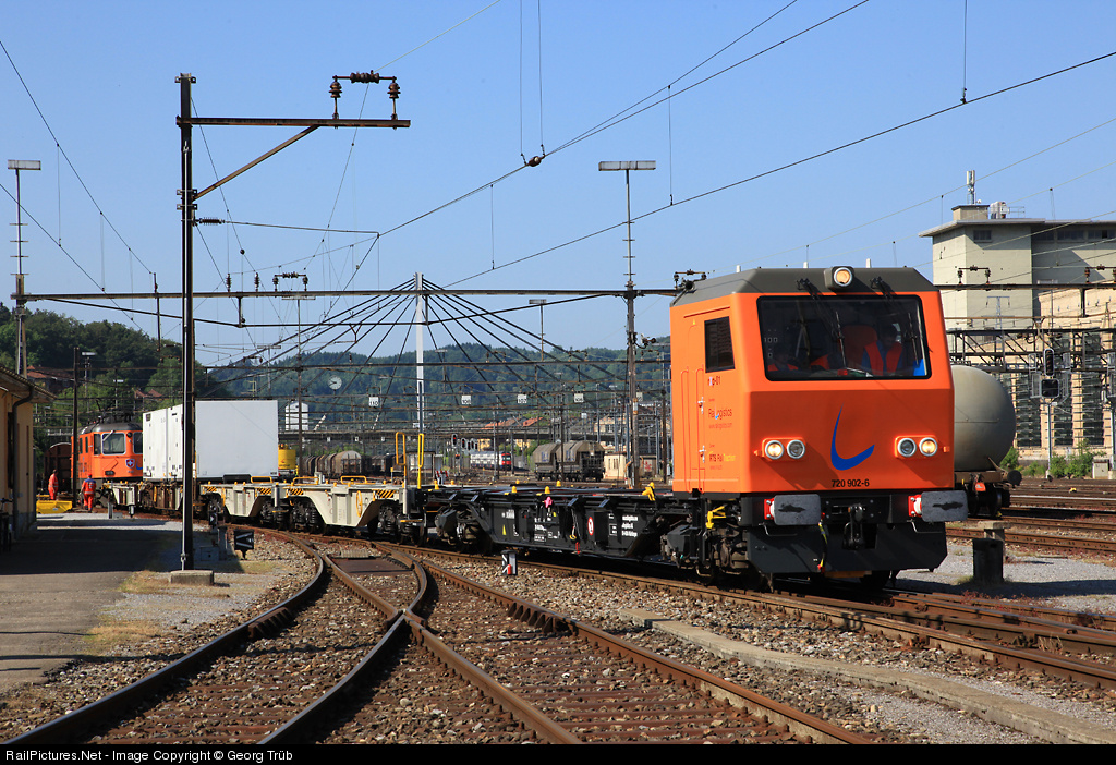 Now a second freight shuttle train is ready, running for Railogistics, carrier is Rail Traction Services (RTS). In front diesel powered ex Cargo Sprinter cab car STmgmss-t 2720 902, in the back Re 4/4 II 11320 of SBB, rented by Railogistic for 3 years and painted in orange colors. The train will transport swap bodies with beer from the Heineken Calanda brewery Felsberg.
