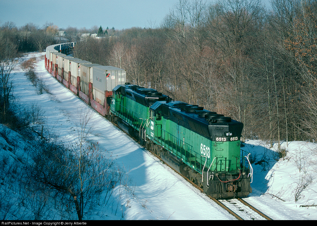 | Two of four SD45s are pulling the stack pack portion of the train south (east) on the Hudson secondary to clear the switch with the Maybrook runner. The other two SD45s will grab the next portion of the train (if there are conventional TOFC/COFC cars) and pull them north to clear the switch so the stacks can tie back on and pull the whole mess clear of the switch again. Once more for any general freight cars. Once the train is reorganized (due to Conrail edict the stacks be on the head-end at all times) they can shove the whole mess north to clear the switch again and tie the other two locomotives back on the head-end and resume their trip east. This practice ended once the new connector between the Tier and ex L&HR was built in spring of 88. |