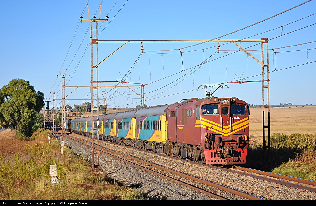 | The Port Elizabeth to Johannesburg "Tourism", speeds north on the Free State main line between Serfontein and Rooiwal behind Class 6E1 E1616, still sporting its original South African Railways red livery. The passenger cars are in the livery of long distance passenger train operator "Shosholoza Meyl", which means "a pleasant journey". |