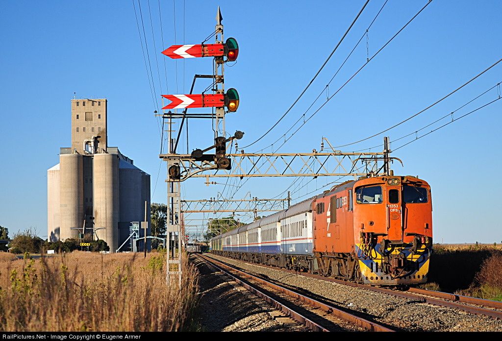 | Class 6E1 E1353 is seen leaving Rooiwal on Easter Monday morning, working a holiday extra from East London to Johannesburg. The load consists of passenger cars in the old Spoornet blue & grey livery, plus four cars in the newer Shosholoza Meyl colours. Rooiwal is one of five remaining stations on this line with operational semaphore signals. |