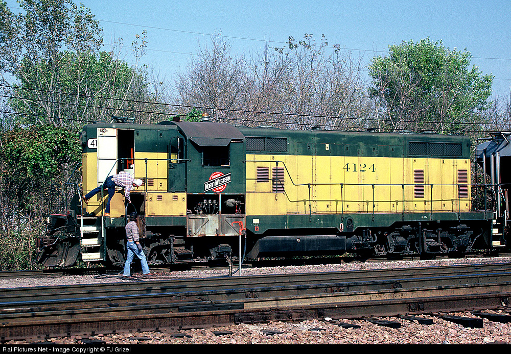 A couple of yard crew members use a hose to wash out the compartments under the cab on GP7R 4124. 4124 was a part of the fleet of GP's that were aquired from the Rock Island at shut down. 4124 was former RI 4449 and 1302. If you look closely you can see a mix of maroon and blue paint on the braces on the open compartment under the cab.