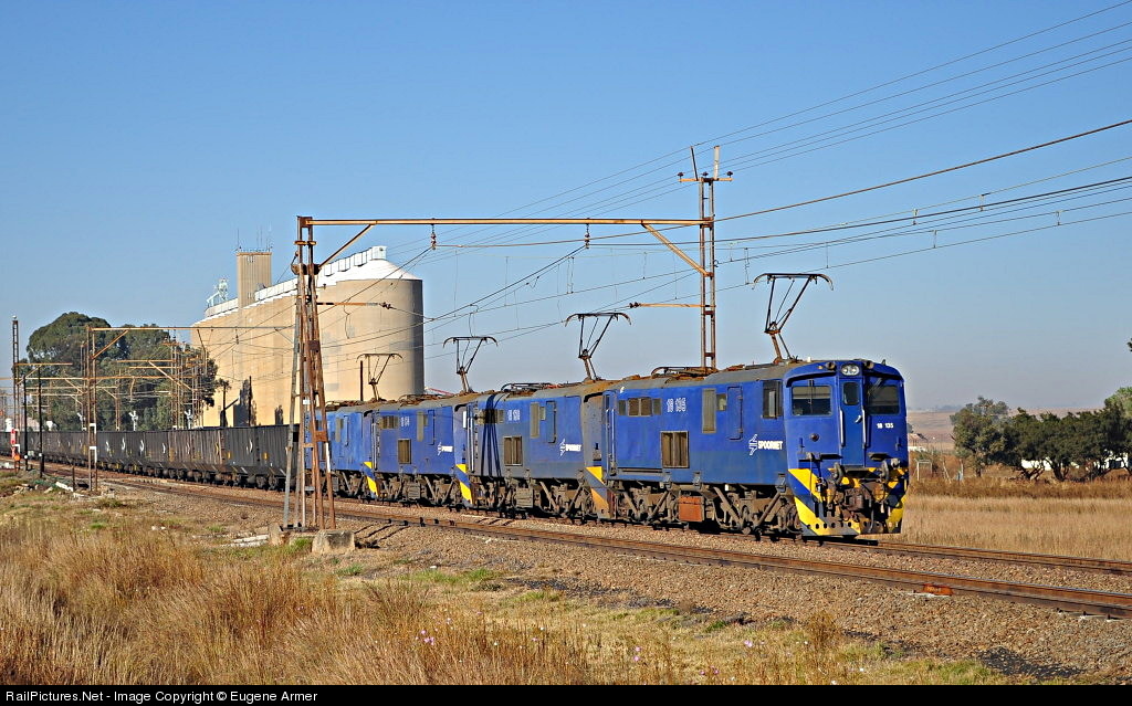 | Four class 18E's (rebuilt from 6E1's) head east through Dryden on a block load of coal empties, returning to the mines near Witbank. |