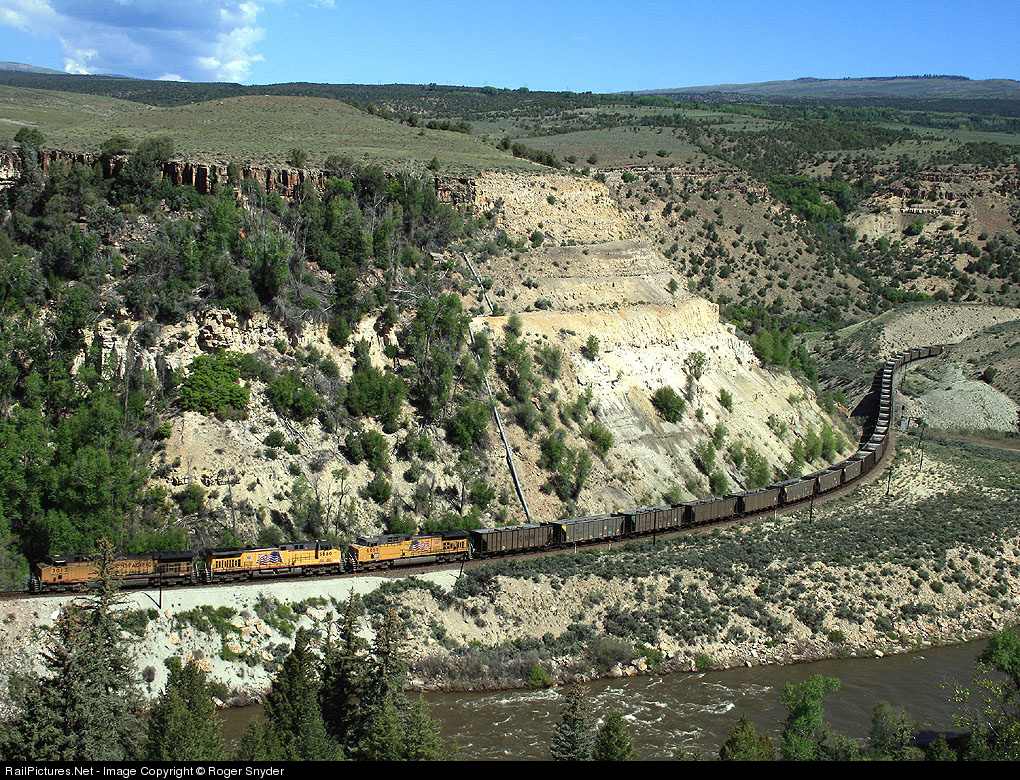 A westbound empty coal train snakes through one of the many "Canyons of the Colorado". Colorado River Rd. follows the river and the railroad for 35 miles between Bond and Dotsero offering numerous scenic venues. The road is dirt but in very good shape.