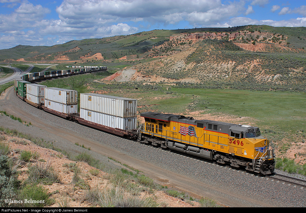 A Union Pacific Global One, IL to Lathrop, CA stacker glides down the Echo Canyon grade at Castle Rock, Utah. UP 5496 has been assigned to keep the train speed under control down the hill to Ogden. The westbound lanes of Interstate 80 are visible at far left.
