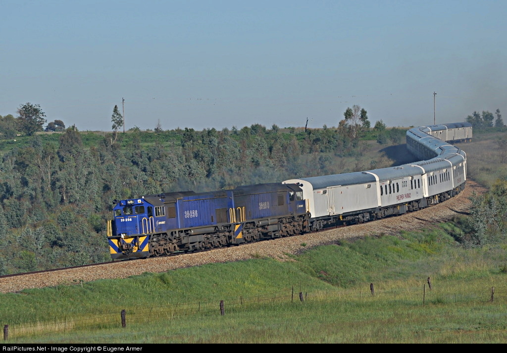 | Soon after leaving Frankfort, the 16-car Phelophepa health care train snakes its way downgrade towards the Wilge River with two Class 35-200's in charge. The train has spent a week serving the local community in Frankfort and is on its way to its next stopover in the town of Ficksburg. |