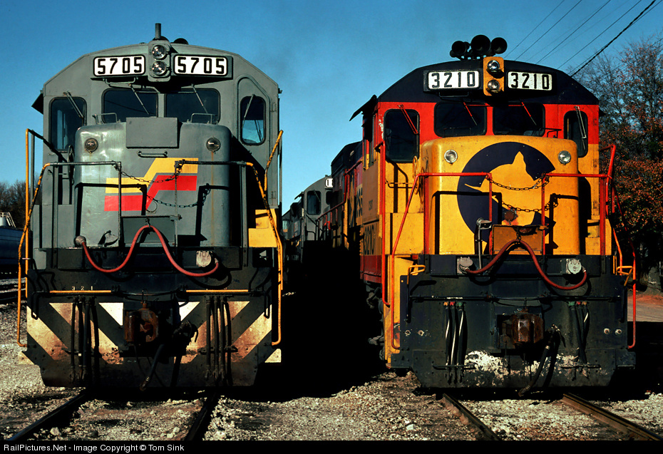 | Seaboard System painted U36B #5705 and Chessie painted U23B #3210 await their next assignment in the yard at Spartanburg, SC in December 1987. |