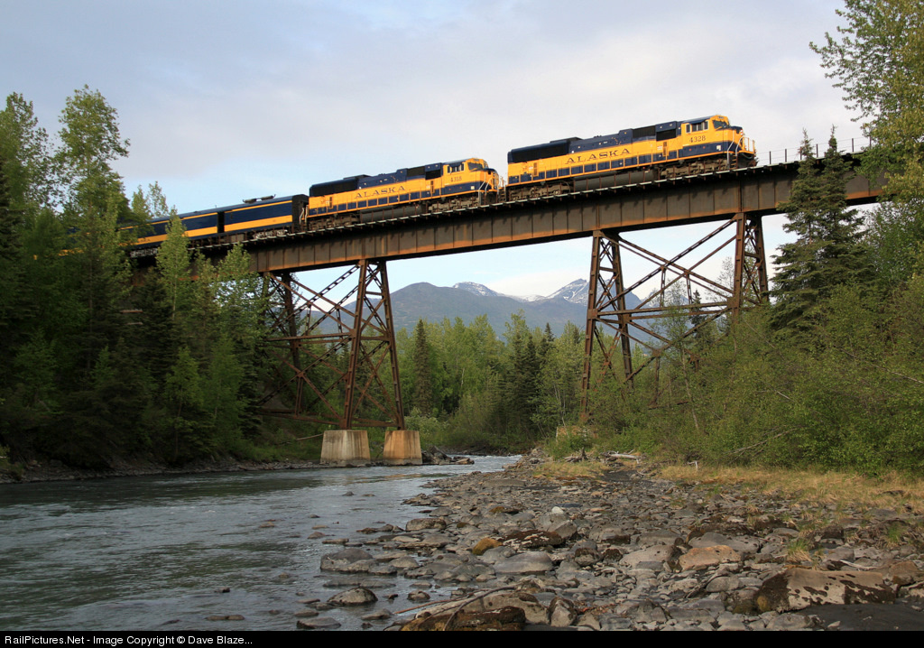 It happened to be my birthday, so to celebrate after work my friend Frank and I decided to try to get this very rare shot. It's rare in that you need access to Ft. Richardson Army base and you have to drive nearly 10 miles of dirt road and then hike one mile in along the river, a location known for its healthy population of bears and wolves! Hence, few railfans ever see this spot except from the open vestibule of an ARR coach sailing high above. In the background the Chugach Mountains rise with snow still covering the peaks. This is the ARR's premier passenger train about 15 minutes and 14 miles out of its destination of Anchorage after running 356 miles from Fairbanks.