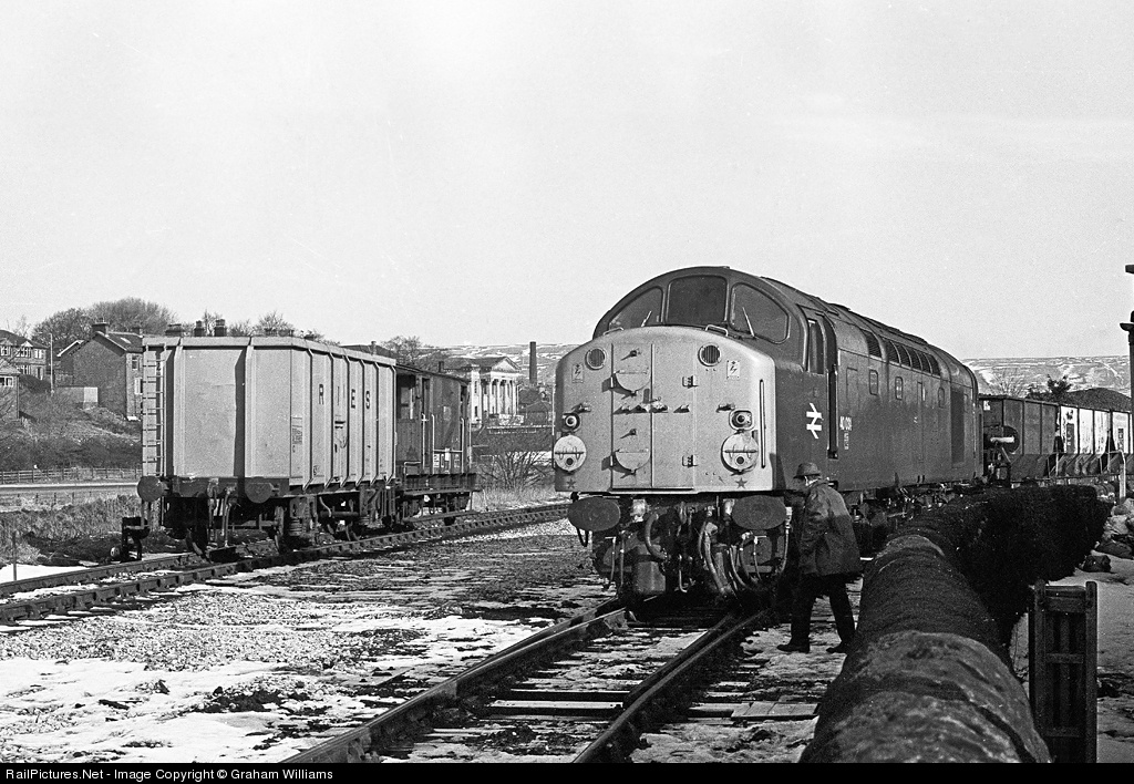 | An old shot from 1979. The line from Rawtenstall to Castleton had been demoted from a busy line to a branch for delivering coal once a week. Here we see Class 40 no. 40 031 shunting the coal wagons at the site of Rawtenstall station. The line was later abandoned by British Rail and taken over by the East Lancashire Railway and is now operated as a heritage line using mainly steam trains. The station has since been rebuilt at Rawtenstall and is the northern terminus of the line. A piece of thirty year old modern history. |
