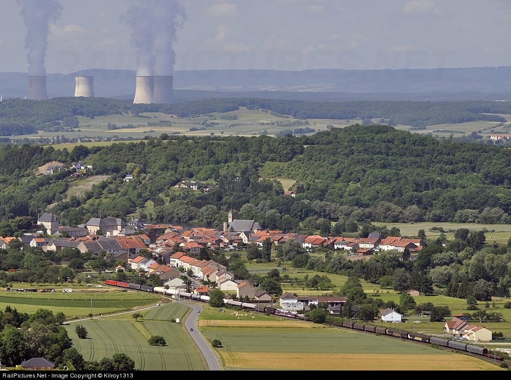 | This mixed freight train pulled by two german 185 series electrics runs towards Thionville after having passed the german/french border line at Apach. In the background is the 4 reactor nuclear plant of Cattenom, the most important of the whole region. |
