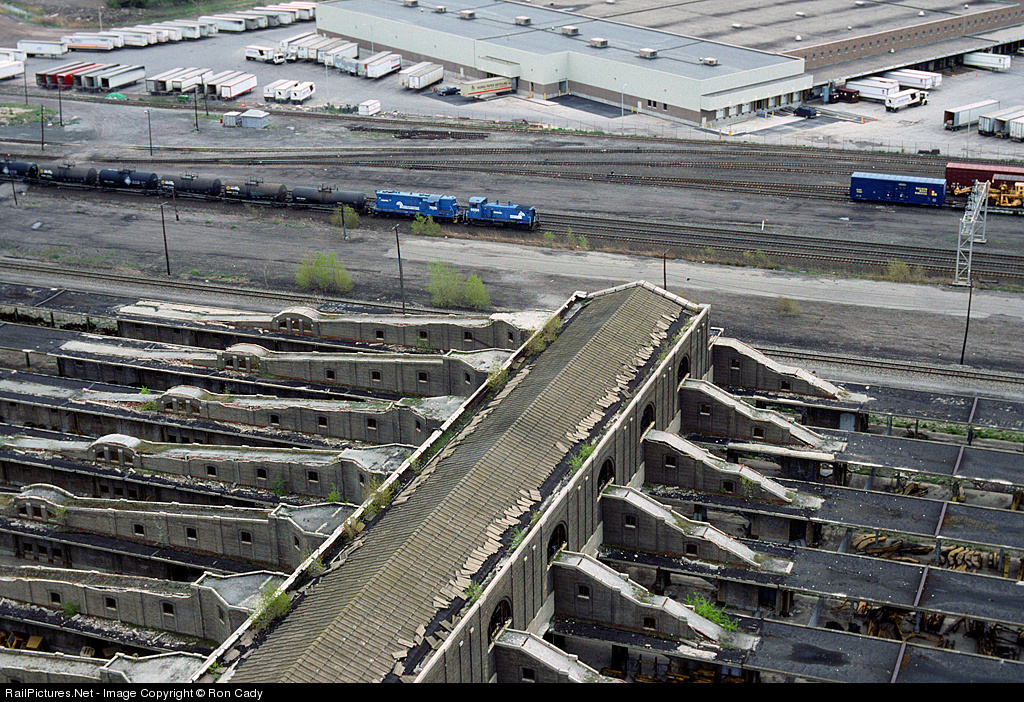 A Conrail train passes the old Buffalo Central Passenger Terminal.