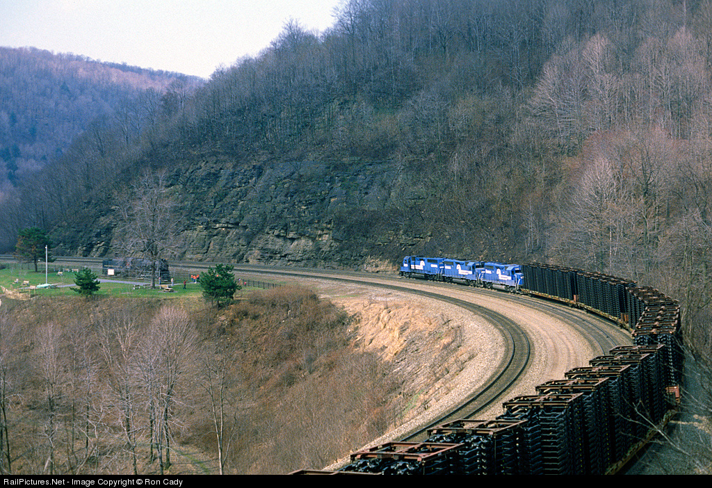 Three Conrail motors lead a train of autoframes around the famous Horse Shoe Curve.