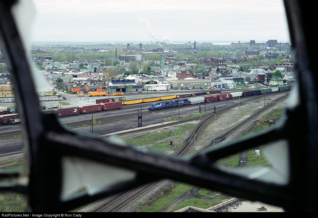 A Conrail train rolls through Buffalo as seen from the abandoned Buffalo Passenger Terminal.