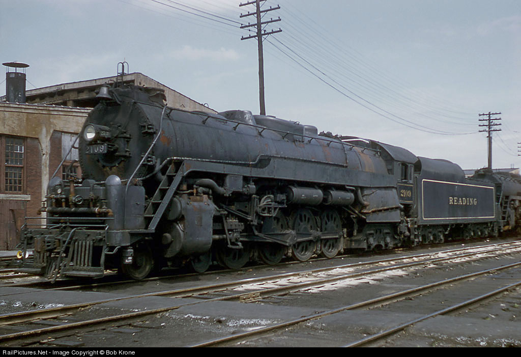 | Reading 4-8-4 2109 is at the front of a line of stored T-1 class engines at Reading. There were still 20 of the husky 4-8-4s on the roster at this date and several had been used as temporary industrial boilers like 2109 as evidenced by extra piping. |