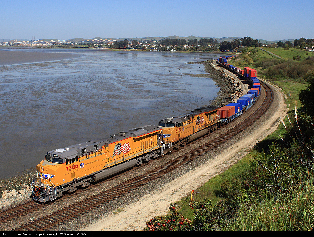 | UP 7386 is on her maiden voyage, leading a gigantic 138-car Global 2, IL to Oakland, CA stacktrain along the banks of the San Pablo Bay. |