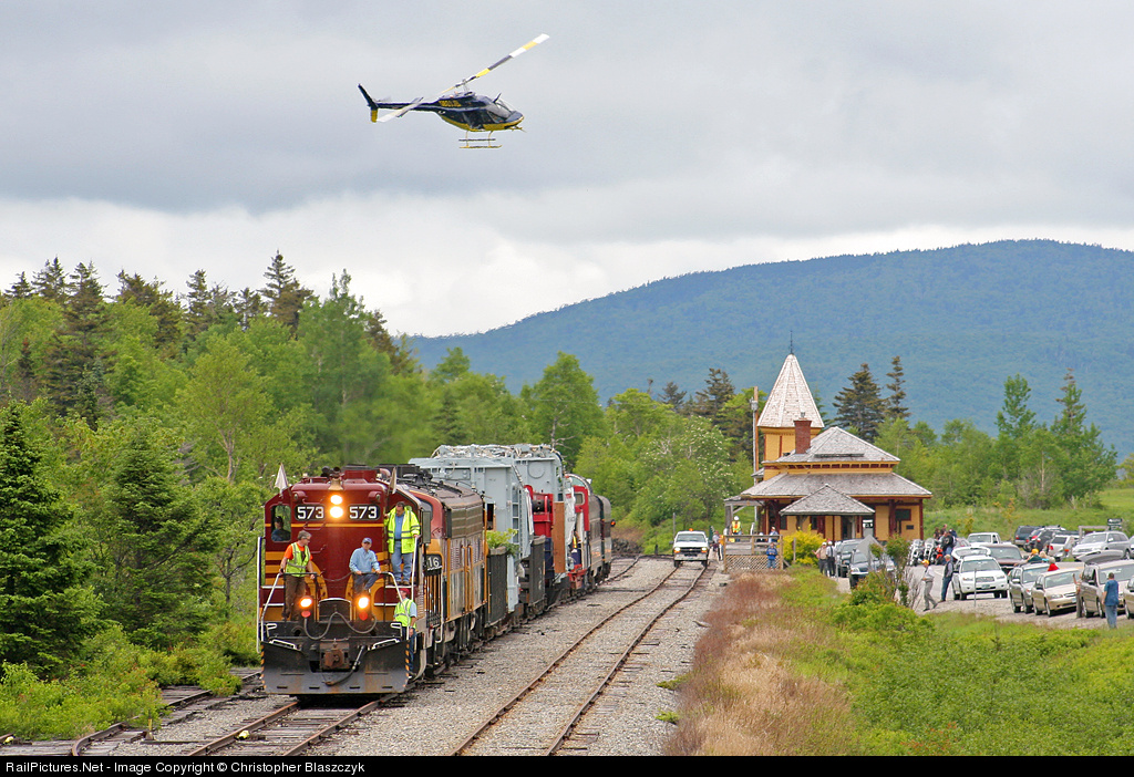 Plenty of eyes... on the ground, on board the train and even in the air carefully watch the special move as it departs Crowford Notch. CSRX 573 leads FP9s 6516 and 6506, a two-piece electrical transformer, two coaches and a handful of spacer cars southward. Upon arrival in North Conway, the transformer will be trucked the remaining few miles to the substation in Conway.