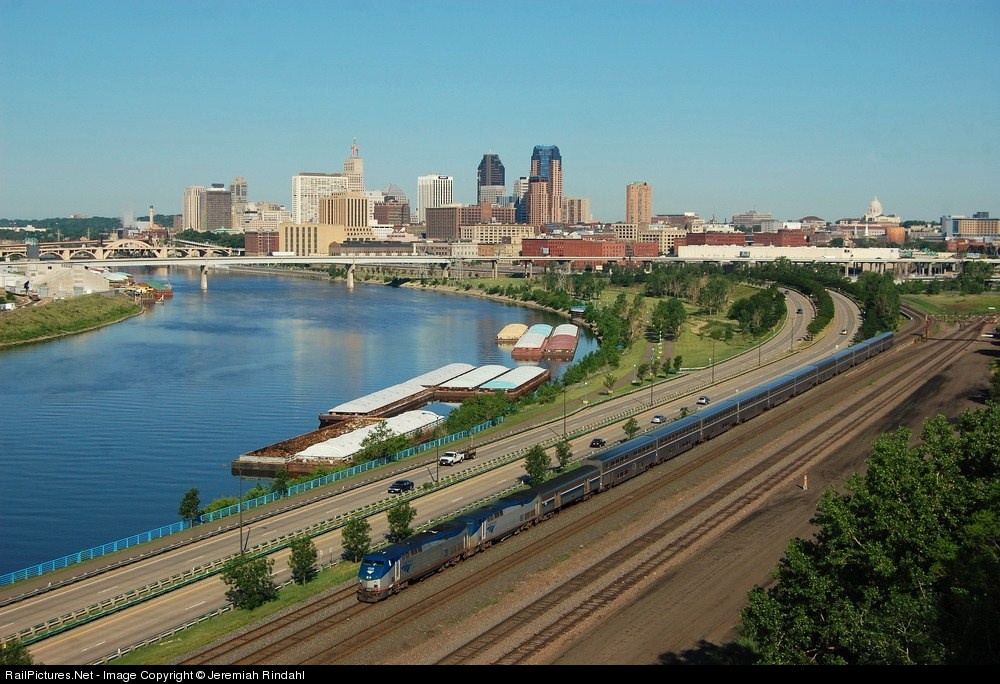 | With a spectacular view of downtown St. Paul, we see the Empire Builder leaving said city behind as it continues its trip toward Chicago. |
