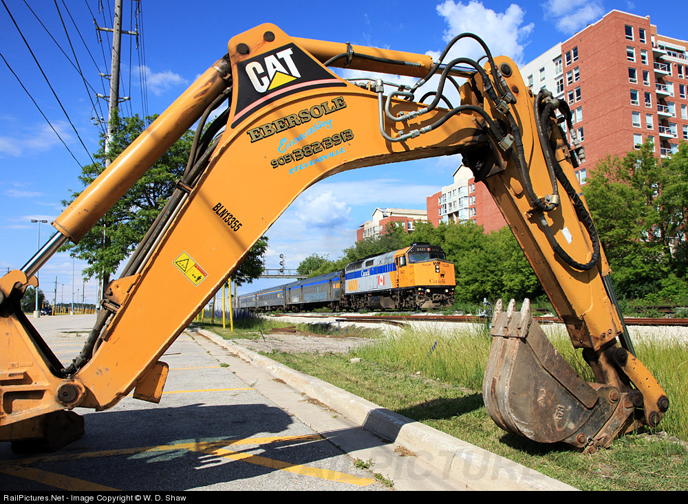 VIA 675 heads west out of Oakville station past a backhoe working on the new third main project, parked for the weekend in ideal position to use as a frame.