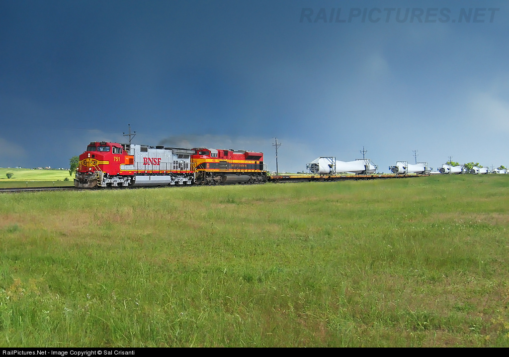 As the sky darkens to the east with a severe thunderstorm moving in towards the west, this BNSF Special Unit Windmill Train from Corpus Christi, TX to Bishop, WY, is seen passing through Longs Peak, CO late in the afternoon. The second motor was a real treat, a KCS Belle unit 4123.
