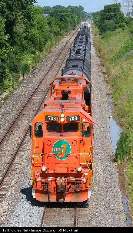 | EJ&E 703, the only GP38-2 on the system and also one of the three J-Balls, leads the N21 south through Crest Hill. |