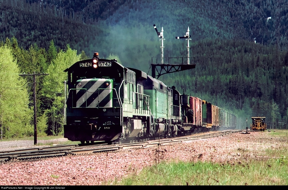 | The semaphore blade falls at Java East as a westbound BN freight works it way towards Essex and Whitefish. This classic lashup of three builders, a GE U33C, EMD F45 and ALCO C-425 (4259 ex-SP&S 321) is not unusual for this time period on the BN or anyother railroad for that matter. This photo proves that power was mixed freely to get the tonnage over the road... |