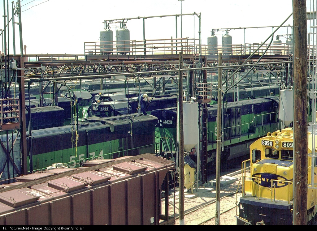 | A bird's-eye view of BN's Alliance engine servicing facilty as seen from the steps of the Motive Power Supervisor's office. How I made my way to this elevated office located in the middle of this facility has escaped my memory, but I seem to recall my presence was a surprise and my reception was less than warm. So, I grabbed a view shots from the steps and left before there was any trouble. I'm guessing there were at least 100 locomotives being serviced in the facility and I will state that I've never seen so many locomotives in one place at one time. |