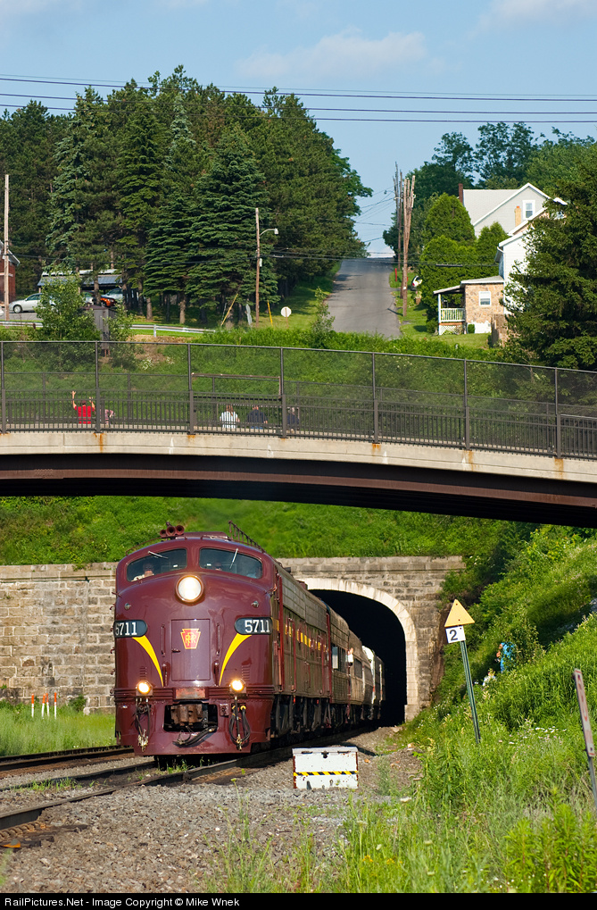 | PRR 5711 makes it's last run of the day as it pops out of the tunnels at Gallitzin. In the background, you can see roads meandering up to the top of tunnel hill. |