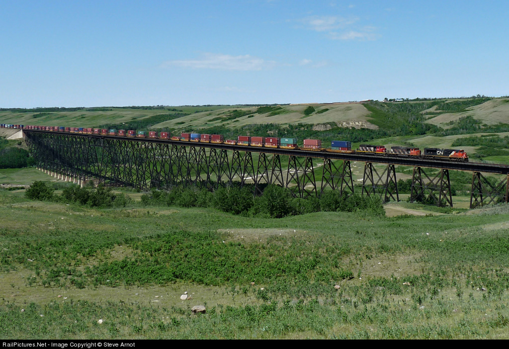 SD70M-2 8843 and SD40-2Ws 5269 and 5347 lead CN's daily Vancouver-Toronto intermodal train Q102 over the 2775' Fabyan Trestle.