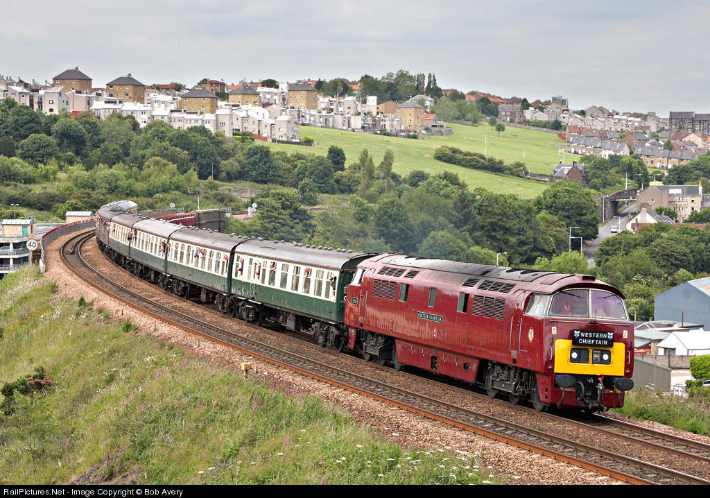 | The sole main-line cetified 'Western' diesel-hydraulic C-C has broken new ground, heading a weekend trip to the Scottish Highlands. On the return run, 'Western Champion' climbs between Inverkeithing and the Forth Bridge, running under caution signals. The train will pause briefly in Edinburgh in about another half-hour. |