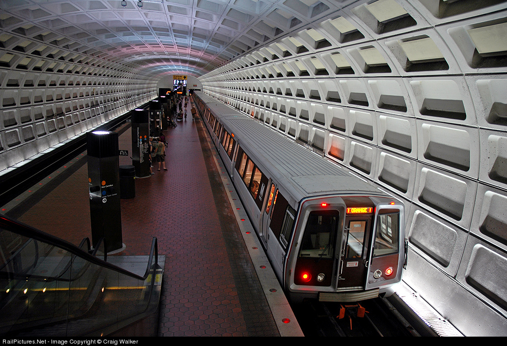 An Orange Line subway train, heading from Vienna-Fairfax (VA) to New Carrollton (MD), pauses at the Stadium-Armory station on June 28, 2009. These Rohr-built cars were the first cars operated on the Metro when it opened in the 1970s.