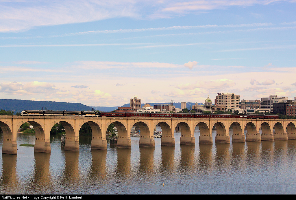 The NS Office Car Special crosses over the Susquehanna River with the Harrisburg city skyline as a backdrop.