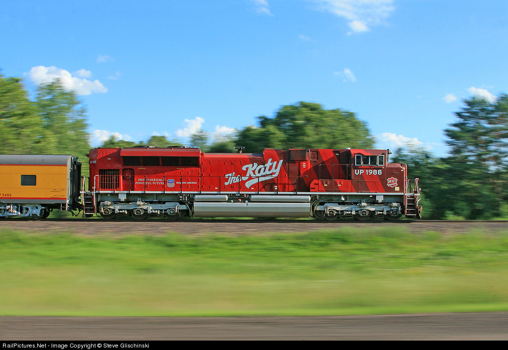 | I can remember looking at photos in books where J. Parker Lamb would shoot pan shots of MKT and GM&O FAs. Well, here's my salute to Mr. Lamb as I pan UP/Katy 1988 at 50 mph on a deadhead OLS special between Necedah and Wyeville, Wis. Speed limits here have been raised to 50 mph. This was shot at 1/30 second. |