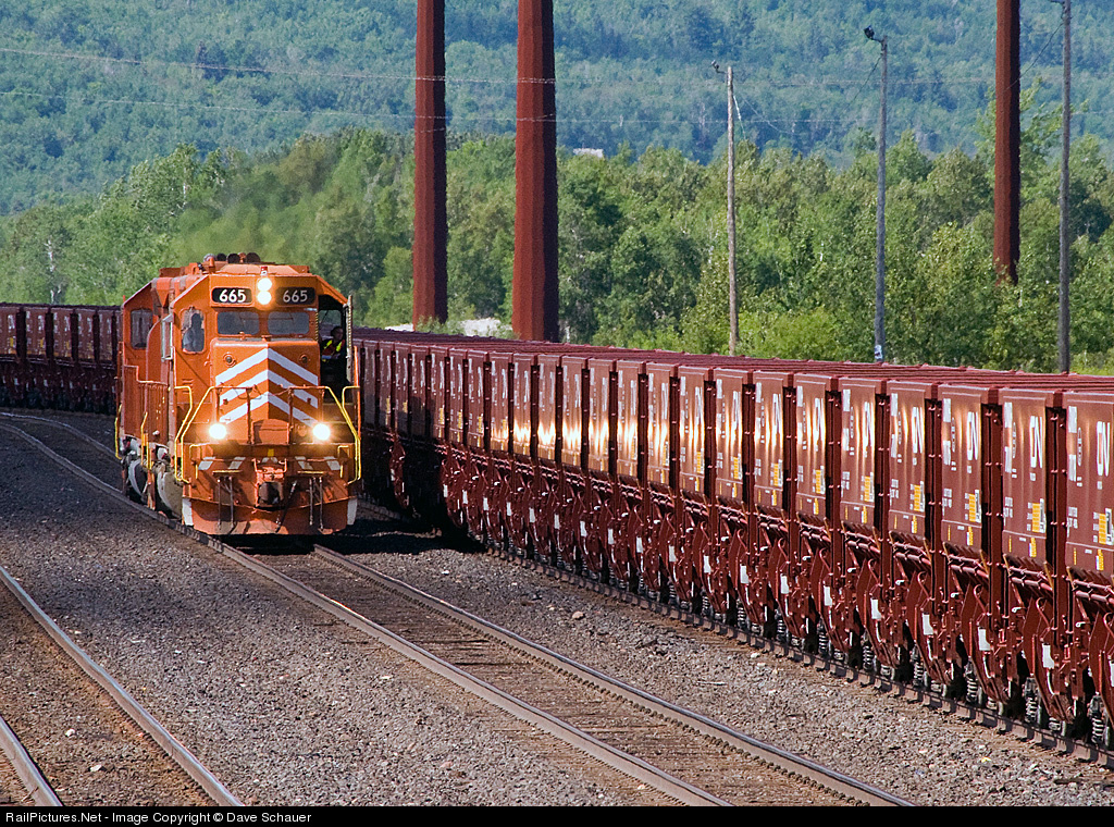 | The ditch lights of EJ&E 665 reflect off the glossy paint on a string of 81 new DM&IR ore cars that had just been delivered. EJ&E 665 and 659 had just assisted a CN freight up Steelton Hill and are returning to home base at Pokegama Yard. The ore cars will head to Proctor Yard. |