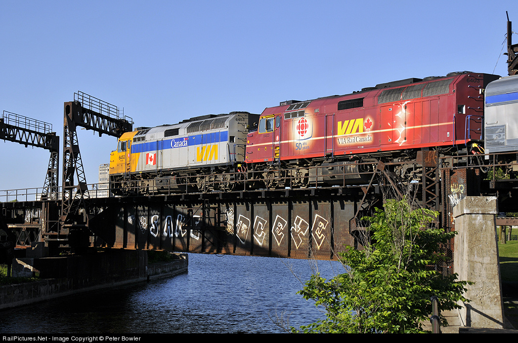 | VIA Oceans crosses Canal LaChine on it way inbound to Montreal Gare Centrale, showing the special scheme on the VIA Rail 50th Anniversary locomotive. |