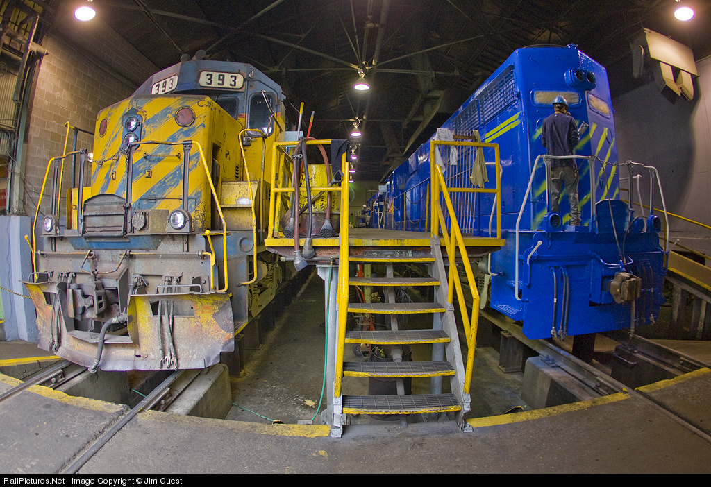 | A new chapter is being created for GP35 391 as the GLC works hard to repaint and repair it prior to Trainfest. On the next track over is GP35 393, which still displays its classic TSBY livery. |