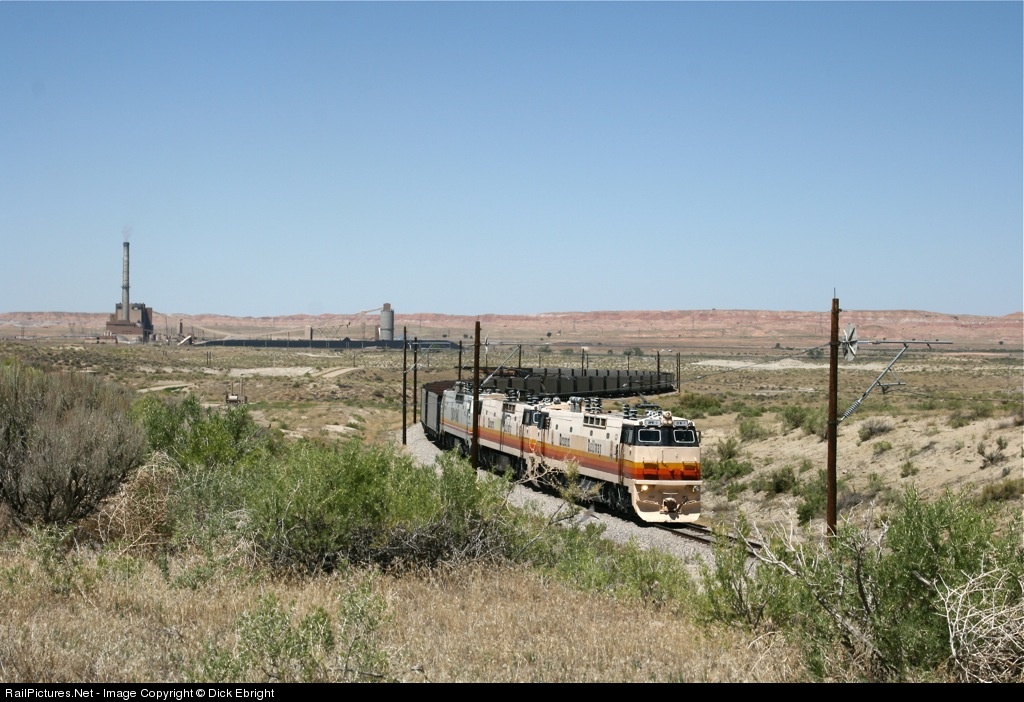 | The Deseret Ry's morning coal loads have finished unloading at the Bonanza Power Plant and are snaking their way through the S curve at MP32. The train is on its way back to the Deserado Mine in Colorado for yet another load of coal. |