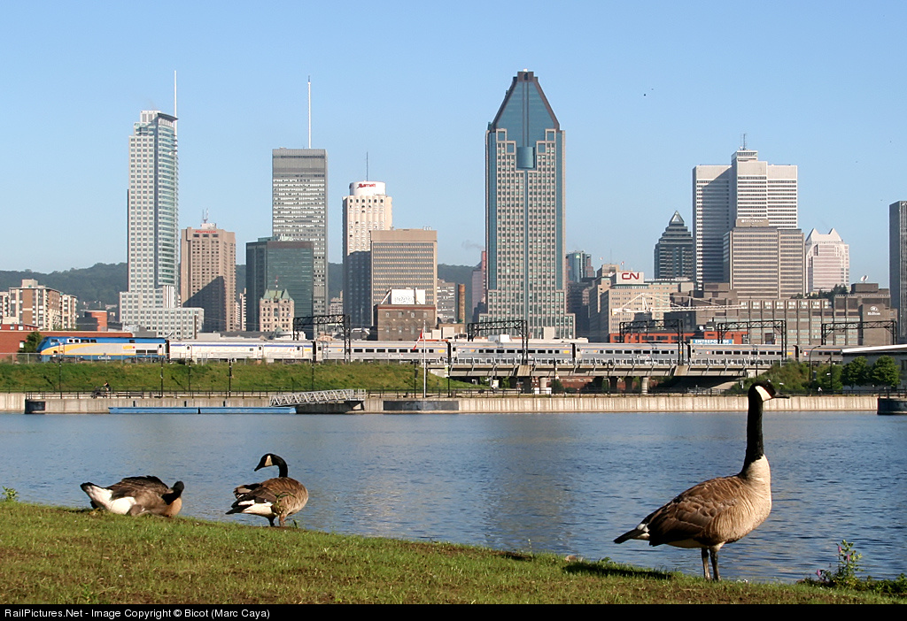 | Everything went as planned on this one with 3 Canada geese being the main actors. The male on the right checked on me while the others where feeding on grass and seeds. In the background, Toronto bound VIA57 is leaving Bonaventure station and passing by Wellington. |