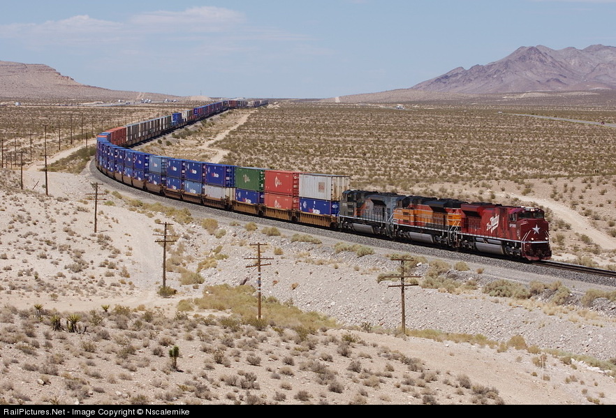 This another very long stacker passing through the Las Vegas area...at over 12,400 ft in length...with an axle count of 526. Lead by UP/MKT Heritage Units 1988, 1996 and 1983