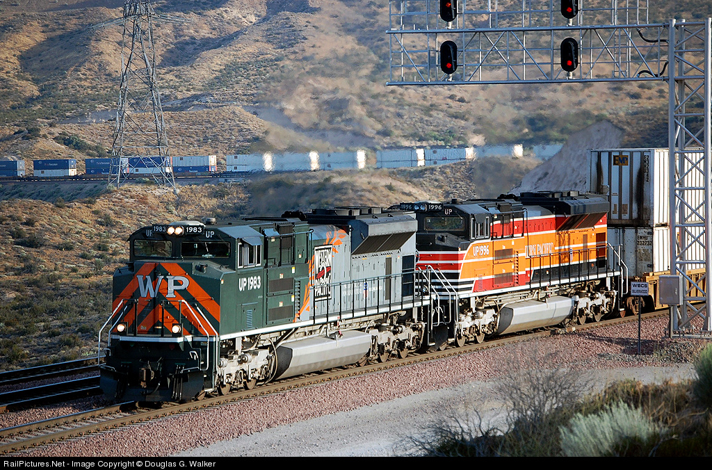A pair of Union Pacific "Heritage" SD70ACe diesels, 1983 (WP) and 1996 (SP), lead train KLAGI-08 east over southern California's Cajon Pass on July 8, 2009. A third "Heritage" SD70ACe, 1995 (CNW) was one of the Distributed Power Units on the rear (along with 5297).