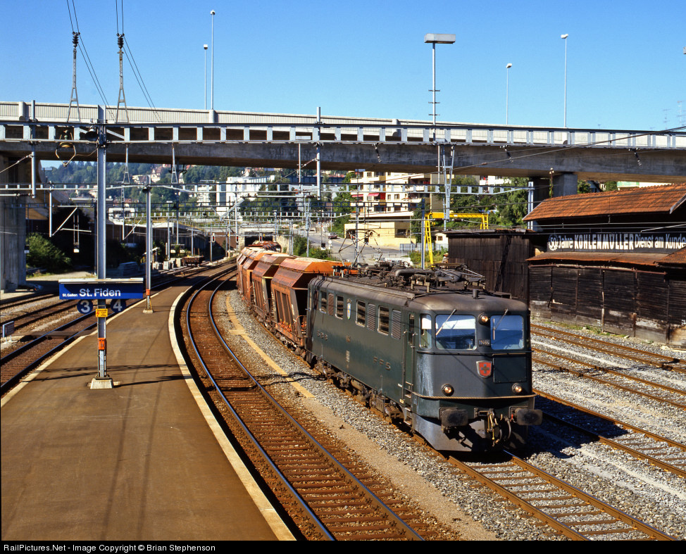 | Named after the town its home depot is located in, No 11464 'Erstfeld' pulls into the loop at the St.Fiden station in St.Gallen with a heavy train of loaded stone hoppers. |