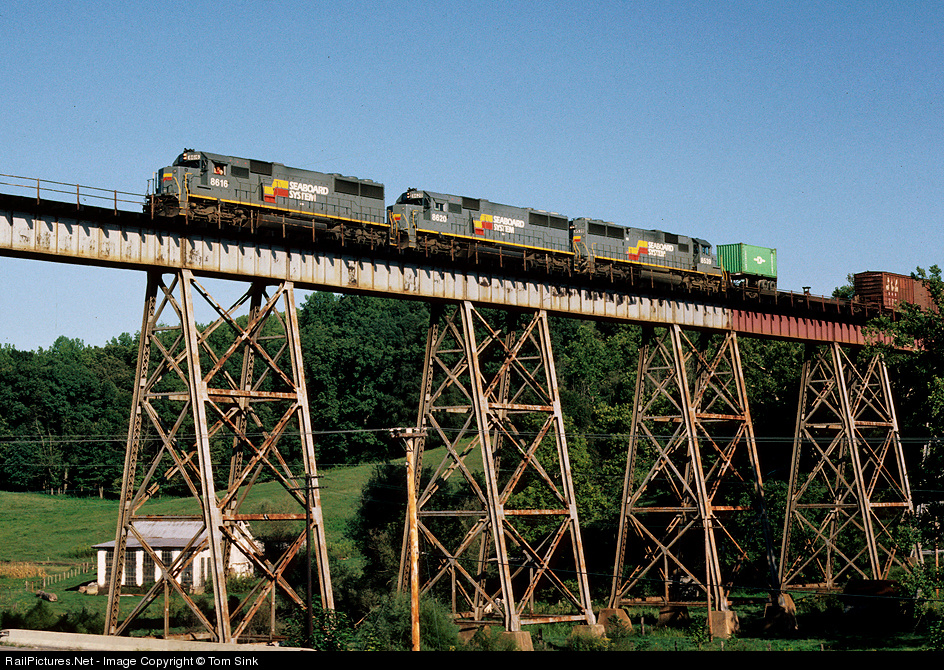 Three Seaboard SD50s lead a northbound mixed freight across the Boones Creek Viaduct north of Johnson City, TN.