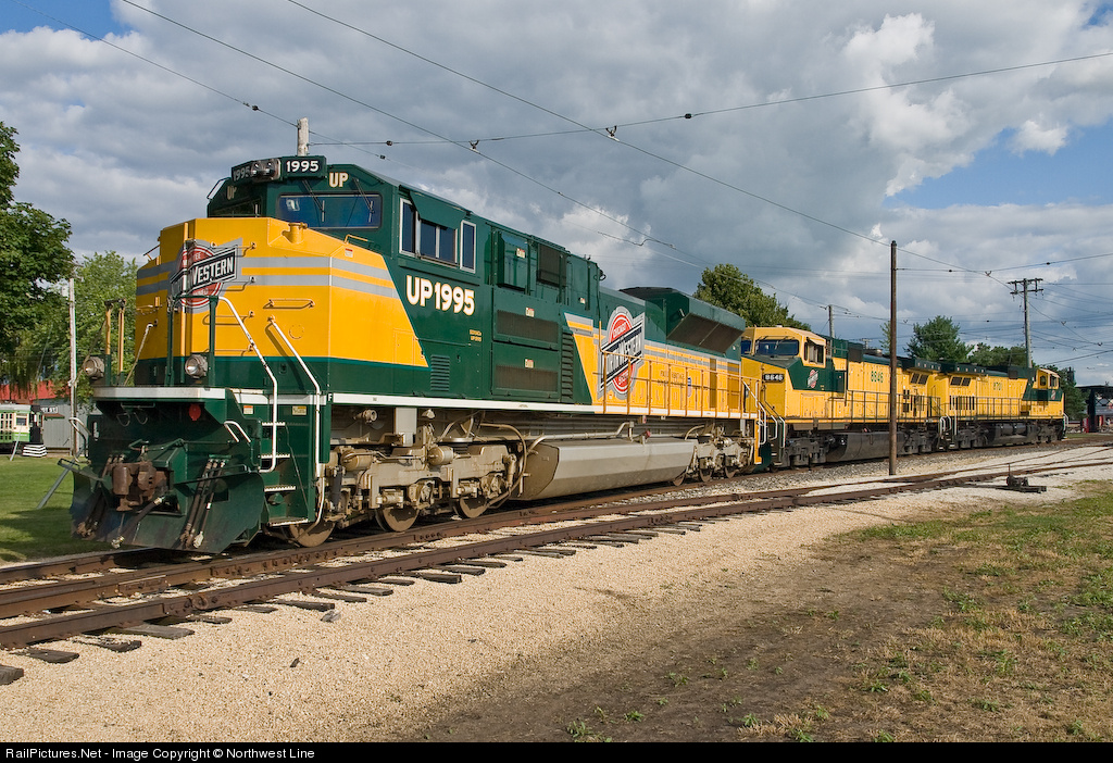 | Union Pacific's CNW Heritage Unit and the last two Dash-9's still in original CNW paint sit on display at the Illinois Railway Museum's "Diesel Day" celebration. |