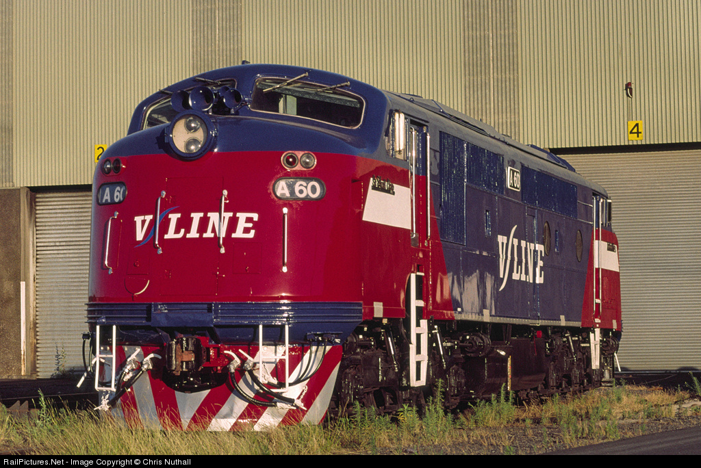 | Just before Christmas 1999, A60 was released from repaint in the then latest V/Line Passenger "Heritage" scheme. Seen here at the rear of the South Dynon locomotive facility. A60, originally built as B60 in 1952, has just clocked up 57 years of continuous service (apart from a year out for rebuild in 1983/4). |