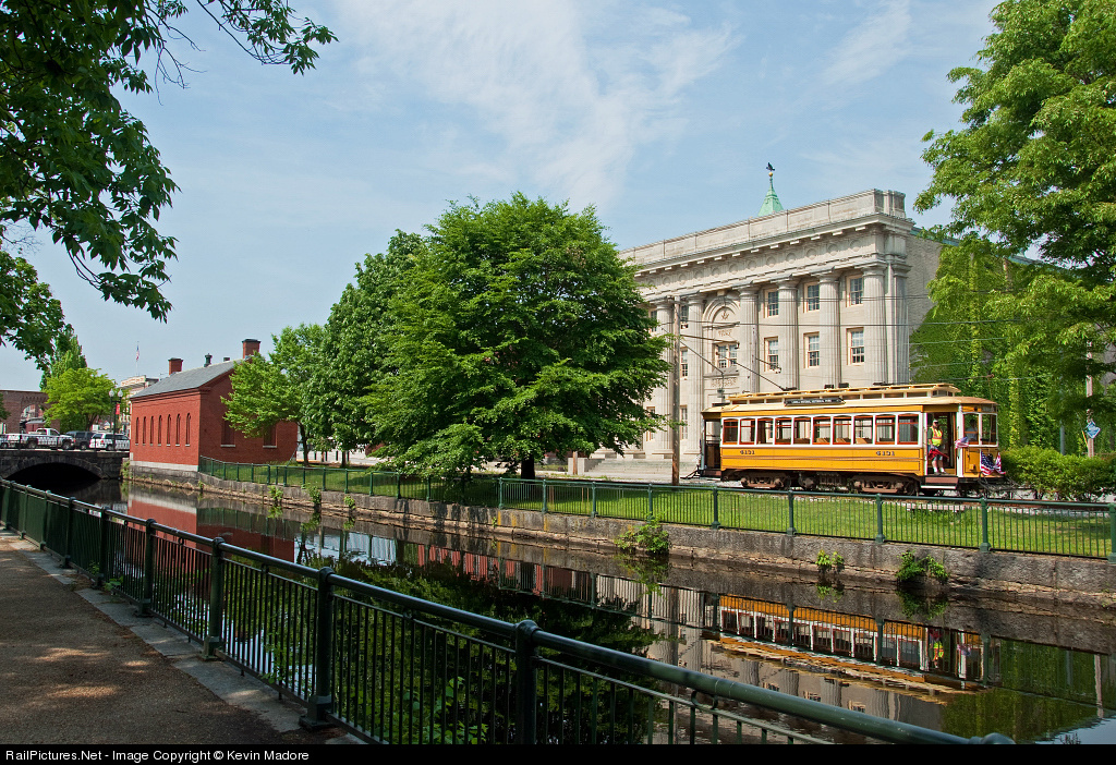 | The City of Lowell, Massachusetts is laced with industrial canals, many of which date back to the early 19th century. These canals channeled water from the nearby Merrimack River to the inner city to power the textile mills that once thrived there. In this shot a trolley from the Lowell National Historical Park runs along the city's Merrimack Canal enroute to a mill that is preserved as a working exhibit. The attractive brick structure on the left side of the photo is the Moody Street Feeder Gatehouse. It houses valves that control the flow of water from the canals to underground viaducts throughout the old mill district. |