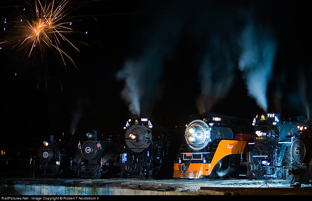 FIREWORKS AT TRAIN FESTIVAL. Little River 1, Little River 110, Pere Marquette 1225, Southern Pacific 4449, Nikle Plate 765 and Flagg Coal 75 sit under the light as a few fireworks are launched overhead.