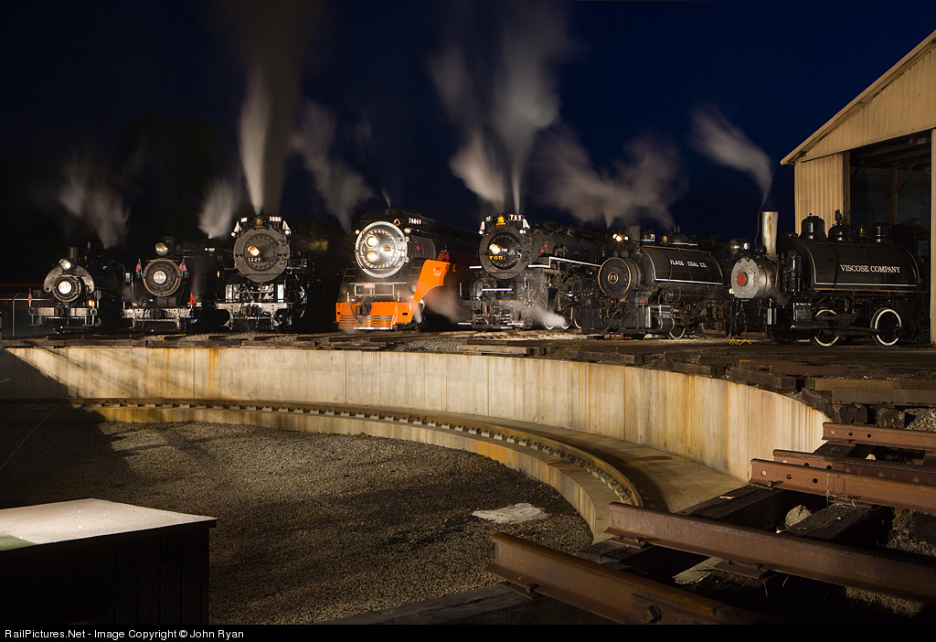 | Seven steam locomotives send their plumes of steam and cinders skywards at TrainFest 2009. The 1225 had a "mechanical problem" later this night, and was sidelined for the rest of the event. |