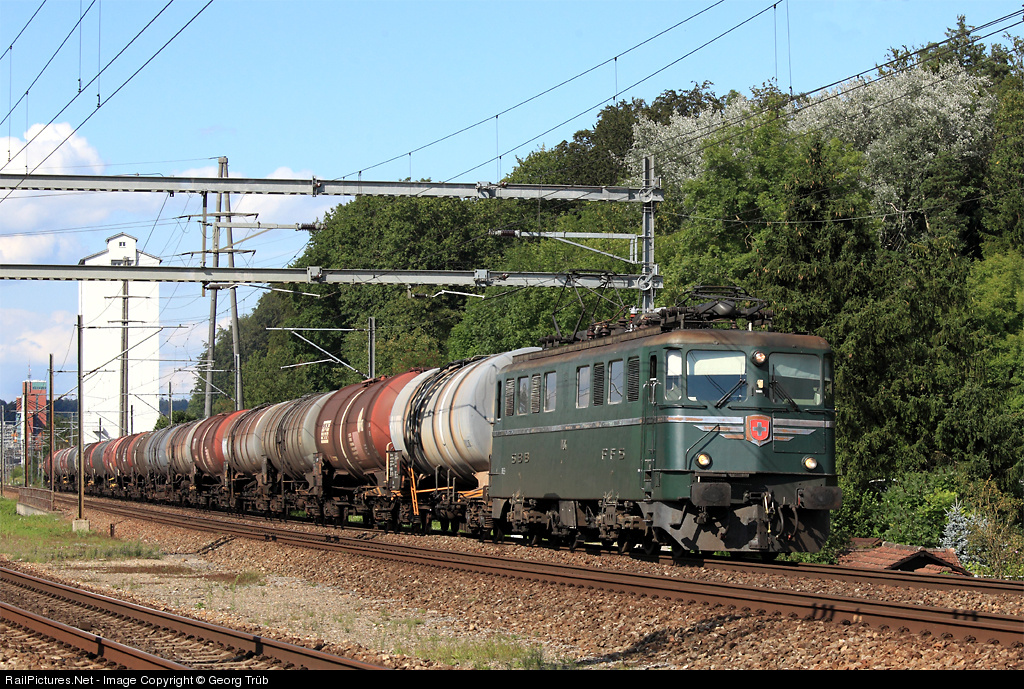 | More than half an hour ahaed of schedule, the oldest operational Ae 6/6 (in regular service) is pulling the empty tank car train 79078/75532 from Islikon to Basel RB (Basel shunting yard) near Winterthur towards Effretikon. The 54 years old veteran lost name and blazon of "Kanton Luzern" some years ago. The locomotive brought the full fuel train (1566 ton) from Basel RB to Islikon in the morning of the same day (train 75509/79027). It is very rare to see the Ae 6/6 locomotives with such heavy trains this days. In the background Neumühle grain elevator and the "Red Tower" in the centre of Winterthur near the station.