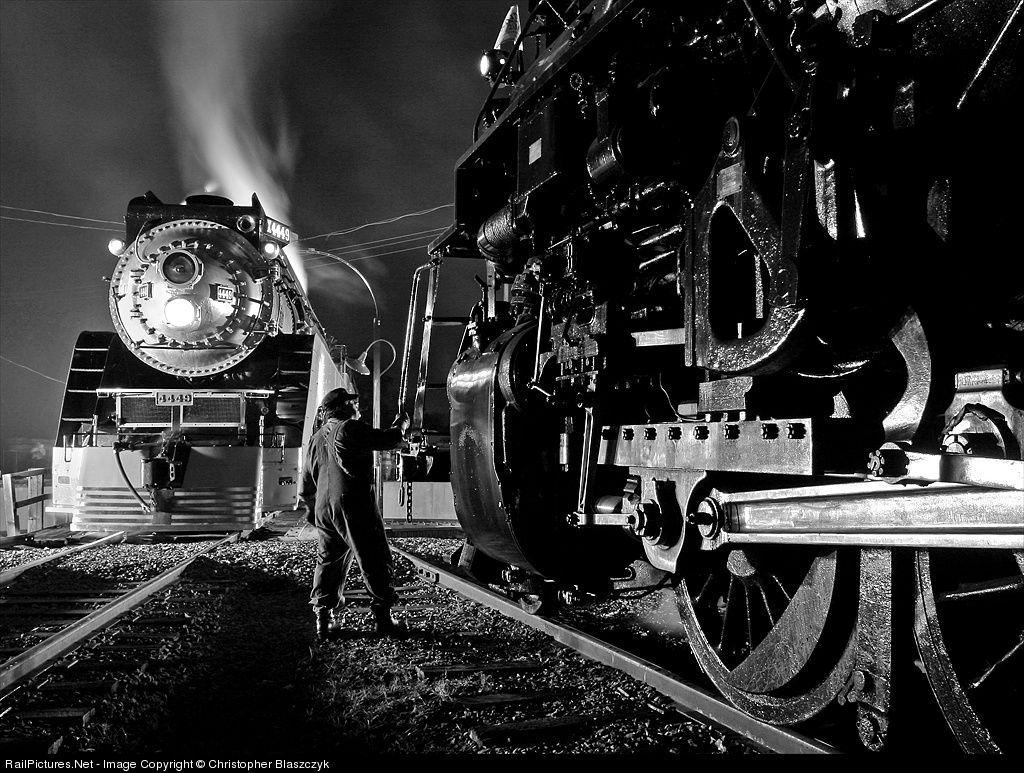 | After a long day of pulling passengers through California, Southern Pacific Daylight 4-8-4 4449 rests on the turntable while the night hostler checks on a nearby unknown engine. |