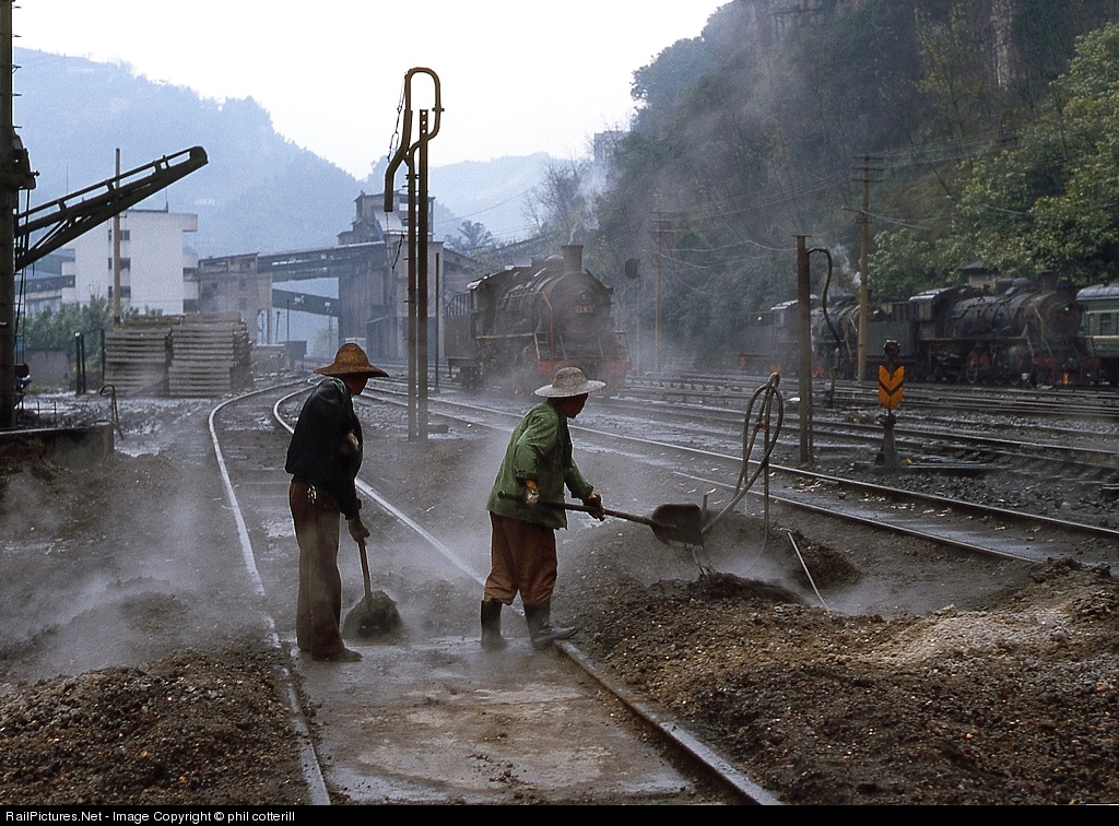 2 labourers move ashes from a recently dropped fire of an SY loco. 3 SYs are seen. Qingqihai is the centre of operations of the Datong coal railway.