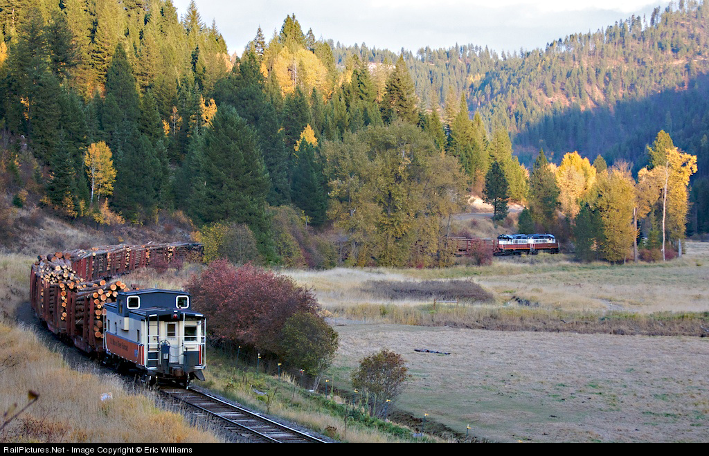With 5 miles to go and the sun exiting the valley, the St. Maries bound logger brings about 35 loads for the large mill located there. Normally there are 80 plus cars separating the engine and caboose making it difficult to get the complete train in a frame, but an extra movement brought down a smaller amount of loaded cars allowing this shot.