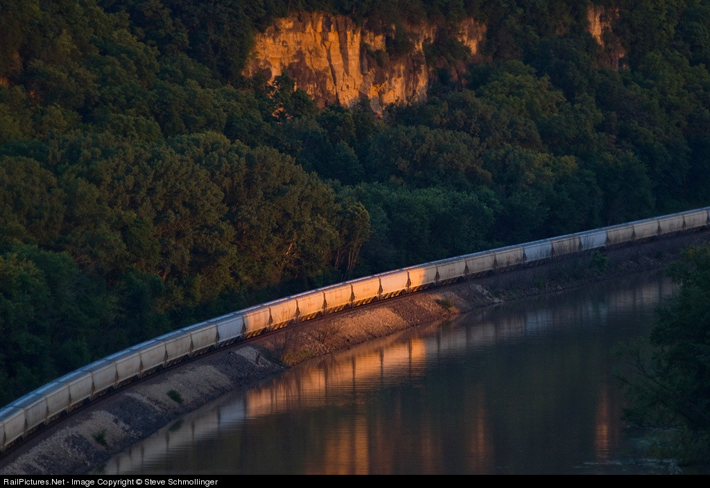 In the last light of the day, a string of VeraSun hoppers makes its way along the Mississippi at the Palisades.